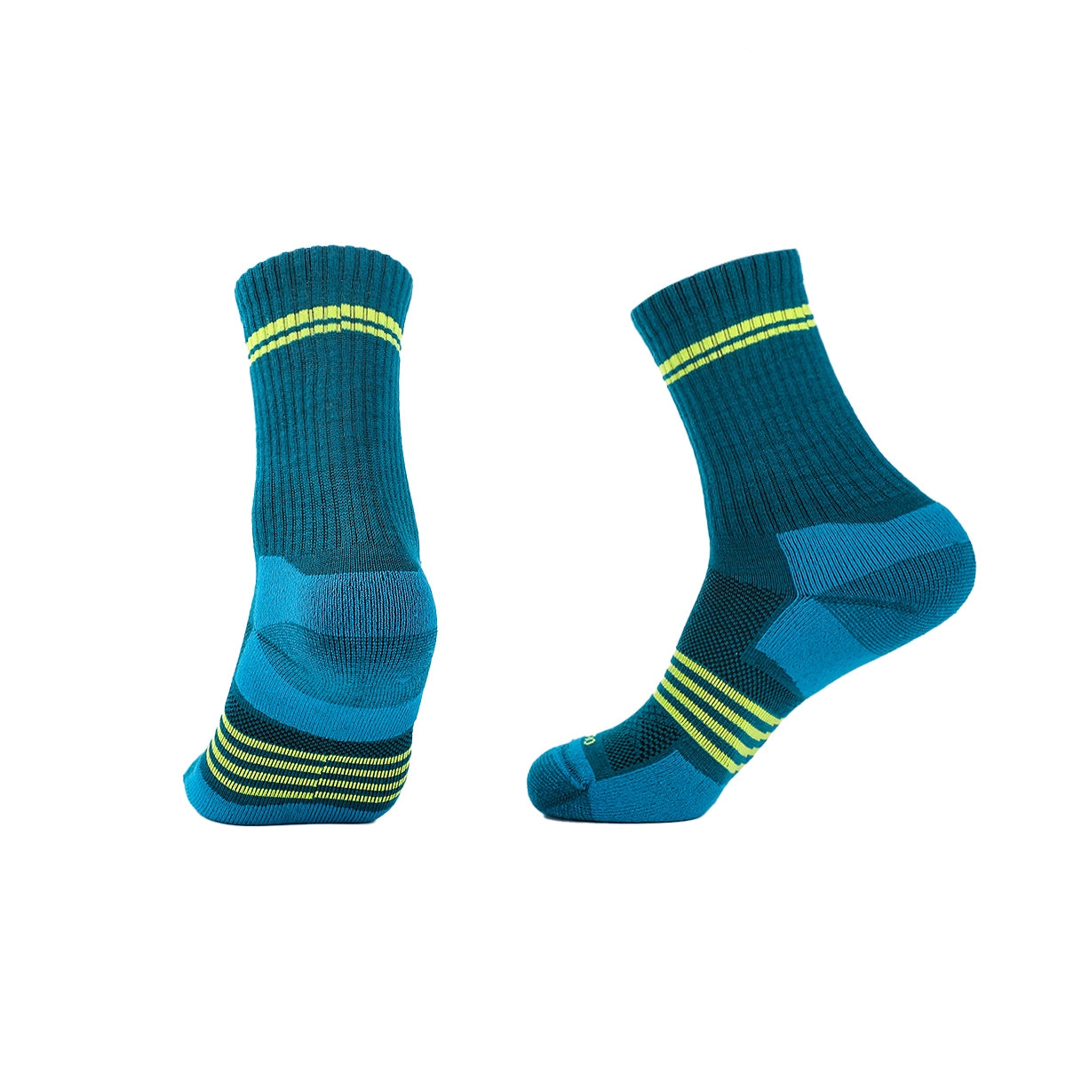 This wool sock features a ribbed top with neon yellow stripes for enhanced visibility and grip. The high-quality material ensures durability and moisture-wicking properties, keeping feet dry and comfortable during intense activities.